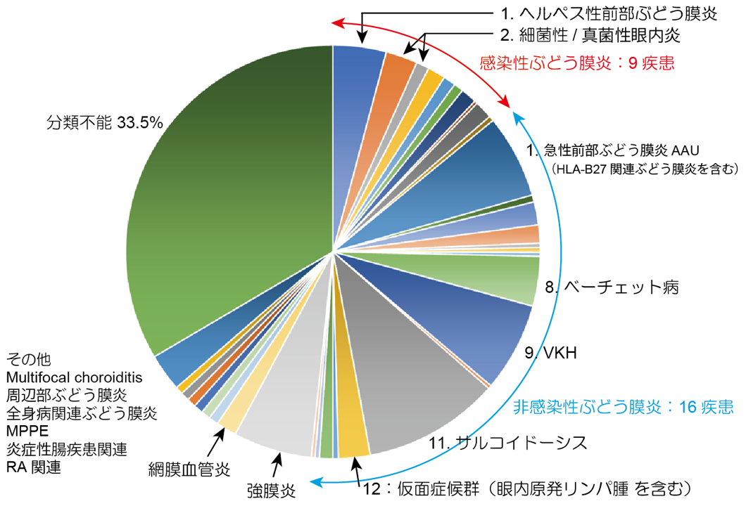 ぶどう膜炎の原因は多彩で[ぶどう膜炎診療ガイドライン](2019年日眼会誌)の各論には感染性9疾患、非感染性16疾患が解説されています。これら25疾患を含むぶどう膜炎の原因別頻度は本邦で2009年に調査されました。Ohg ...