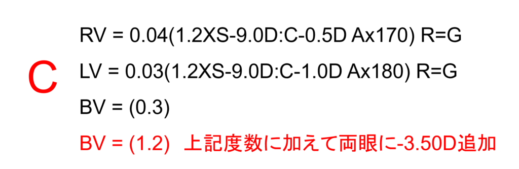 そこでCのように両眼視力を最高にするため両眼に付加した最小のマイナスレンズ度数を記載すれば近視化の程度(近視化度数)が把握できます。