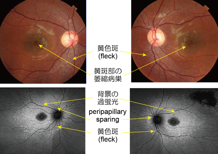 ①眼底写真で黄斑部の萎縮病巣と黄斑周囲の黄色斑fleckが観察される