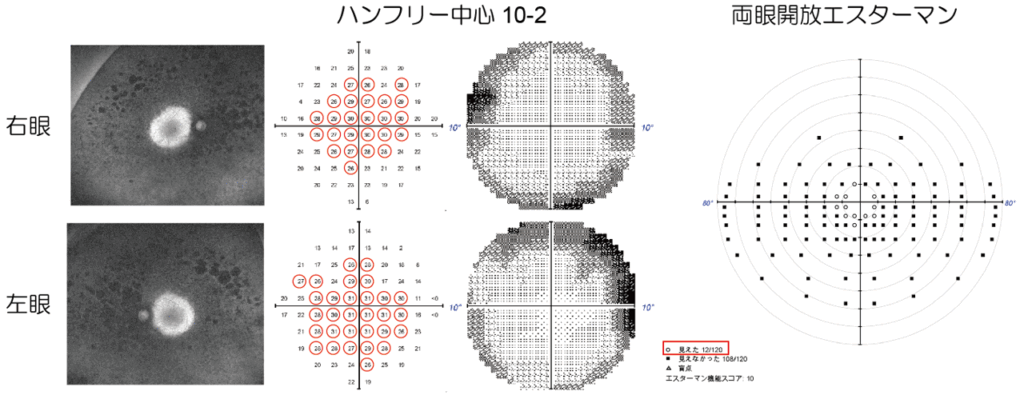 図右の両眼開放エスターマンテストでは、赤枠で示すごとく[〇 見えた 12/120]の結果で[両眼開放視野視認点数]は12となりました。
