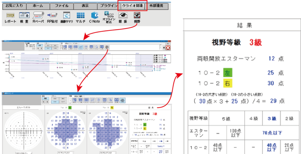 すると図左中段の画面(この画面は10-2視野のMDスロープのグラフ)が現れ、上部の[視覚障害]のアイコンをクリックすると図左下段のように両眼開放エスターマンと左右眼の10-2視野の結果とともに、右端に視野等級の計算結果が示されます。
