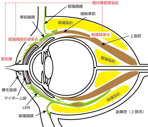 ちなみに眼窩隔膜よりも前方の病変は眼瞼蜂巣炎または眼窩隔膜前蜂巣炎 preseptal cellulitisと呼ばれます。