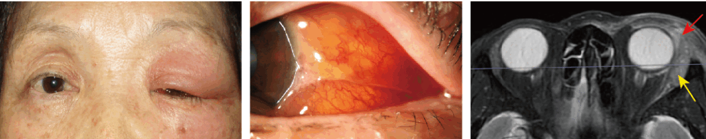 左上眼瞼の発赤腫脹(図左)と結膜の充血浮腫(図中央)が著明で、左方視で複視を自覚しました(矯正視力は1.0/0.7)。