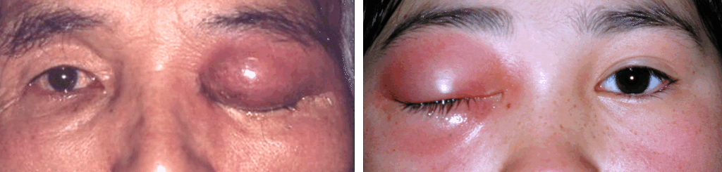 眼窩蜂巣炎では痛み(眼周囲痛、眼窩部痛)と開瞼が困難なほどの著しい眼瞼の発赤腫脹が特徴的です。