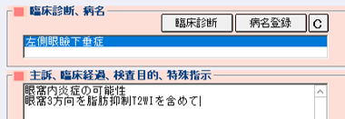 全脳を選択すると水平断(axial:軸位断で頭側-尾側の体軸に垂直な断面)の画像しか通常は撮影されませんが、眼窩疾患では冠状断coronal (顔の前後軸に垂直な断面)と矢状断sagittal(左右軸に垂直な断面)を含めた3方向の画像が必要で、撮影コメントに眼窩3方向と記載します。