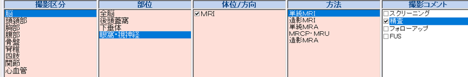 図のY大学病院のMRIオーダー画面では、撮影区分:脳→部位を選択する際、全脳ではなく眼窩・視神経を選択します。