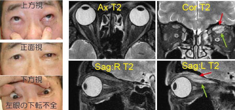 図右の4分割MRIでは左眼の眼眼瞼挙筋(赤矢印)と上直筋(緑矢印)に強い炎症が横断面、縦断面の両方で確認できます。