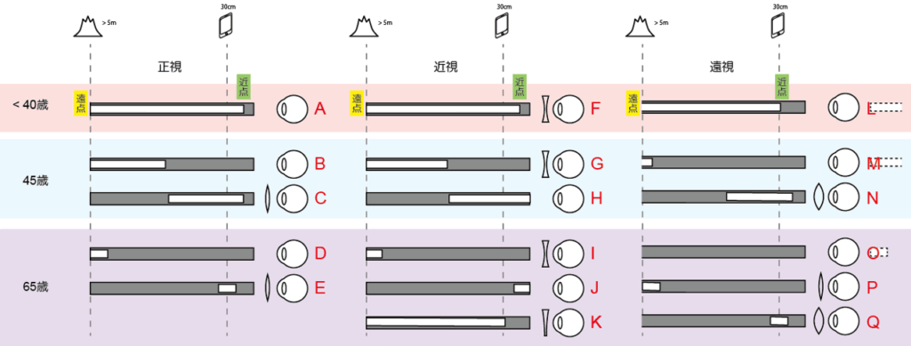正視(D、E)と近視(I、J)ではメガネ使用に関して、中段の老視初期と大きな違いはありませんが、メガネの常用に慣れている近視では遠近両用の累進レンズメガネhttps://meisha.info/archives/374も有用な選択肢です(K)。