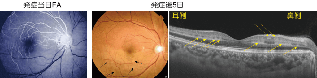 5日後の大学病院初診時、視力は裸眼で1.2/2.0と良好ですが、右眼の耳側下方網膜にまだらな白濁がみられ(図中央矢印)、水平断面のOCTで中心窩の耳側と鼻側に断続する高反射がINL(実線矢印)と一部神経節細胞層(点線矢印)にみられ、BRAOに伴うPAMMと診断されました。