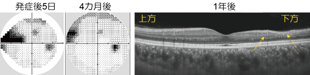 視野検査では鼻側上方の暗点は1年後には目立たなくなっていました(図左と中央)。