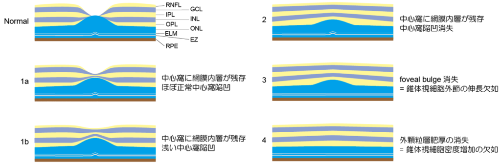 黄斑低形成の程度はOCT所見によって図のように分類されます。