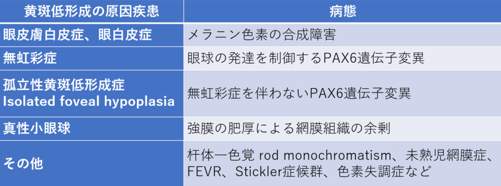 黄斑中央、直径1.5mm https://meisha.info/archives/4066の陥凹部である中心窩https://meisha.info/archives/6158が正常に形成されない黄斑低形成foveal hypoplasiaの原因としては表のような疾患があります。