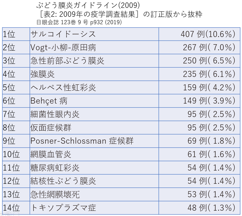 GLの表2:2009年の疫学調査結果で第3位の急性前部ぶどう膜炎はHLA-B27関連ぶどう膜炎(強直性脊椎炎、炎症性腸疾患、ライター病、乾癬などを合併)とオーバーラップします。