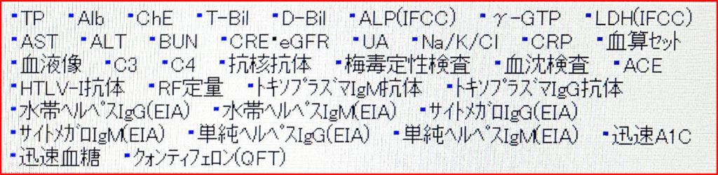 血算と一般的な生化学検査に加えて上記血液検査項目が並びますが、上記表中の赤字の検査は含まれていません。
