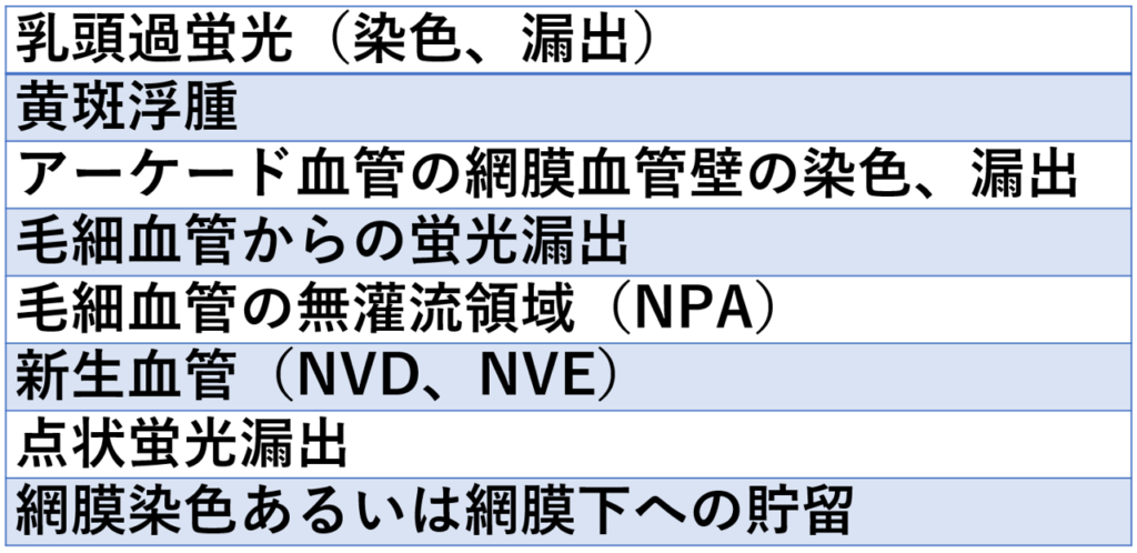ぶどう膜炎でみられるFA所見としては上記を含め表のようなものがあります。