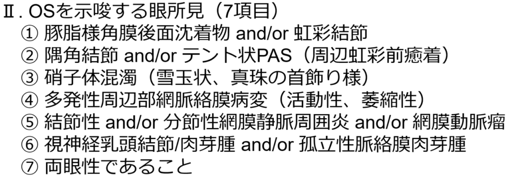 ③ Probable OS:BHLなしだが、Ⅱ. 眼所見3項目以上とⅢ. 全身検査所見の2項目以上