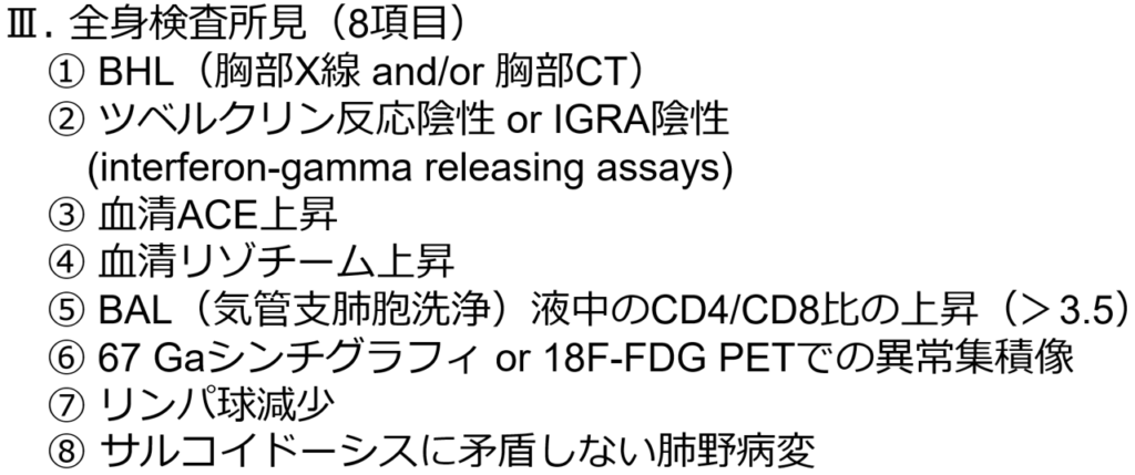 一方、胸部X線または胸部CT像での両側肺門部リンパ節腫大(BHL)は生検陽性に匹敵する価値が認められ、その有無によって② Presumed OS③ Probable OSの基準が表のように設定されました。
