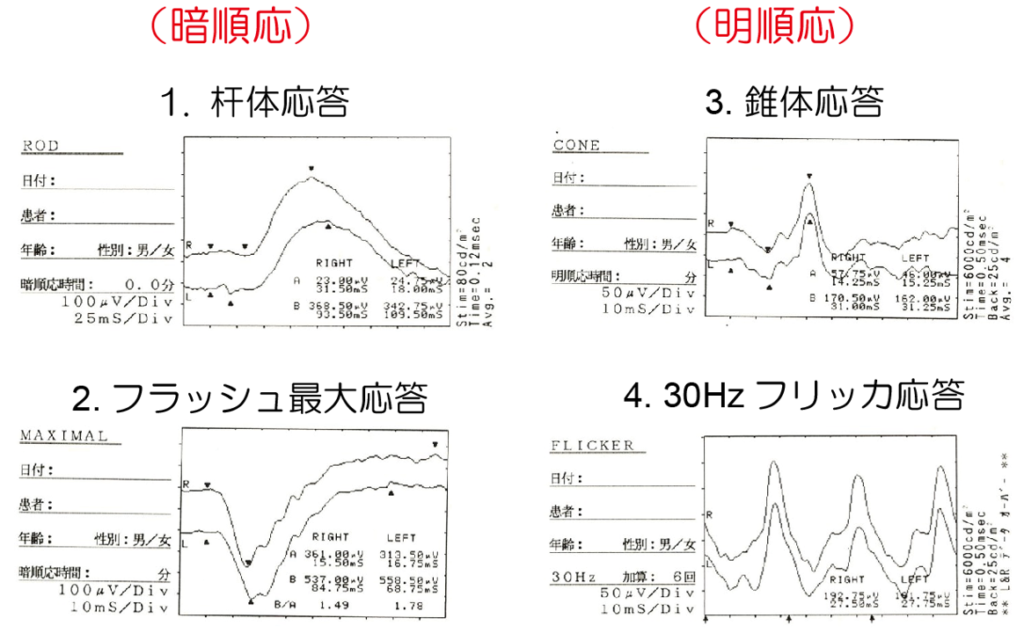視細胞を構成する杆体と錐体https://meisha.info/archives/5985の反応の違いを利用して、通常4種類のERG波形を記録します。