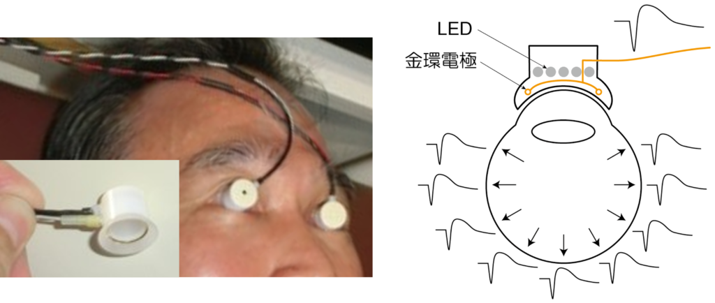 動物実験では電極を網膜に直接差し込んだ状態で光を照射して電位変化を記録できますが、臨床では角膜または皮膚電極で記録します。